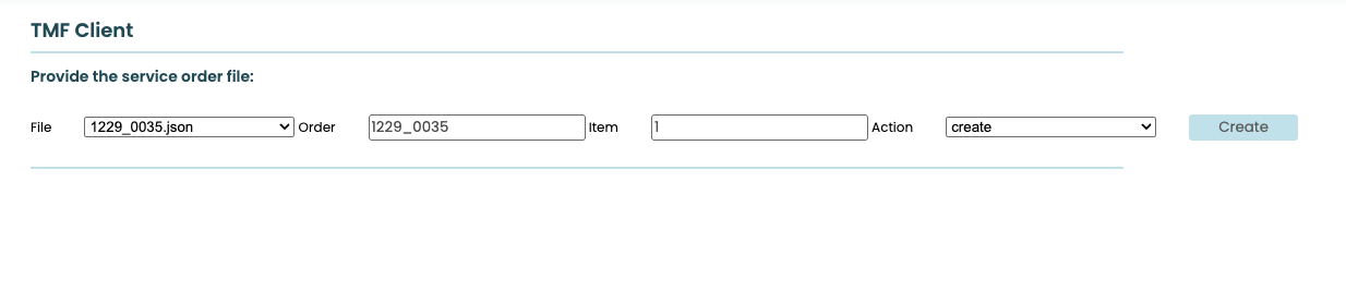 In the field next to it you need to specify the order id, followed by the item id and then the action you want to perform on it. If no item id is provided, the default item id of '1' is used. Once the fields are filled in correctly, you can click on the button 'Create' to start up the tmf client tool. The output of the command is displayed on screen: