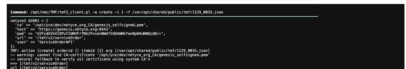 - The tmf client tool reads its service orders from the /var/opt/shared/public/tmf directory. This folder needs to be created and have reading and writing permissions. - The script tmf2_client.pl needs to be set up correctly. Its configuration settings are found in the file /opt/nms/TMF/tmf2_client.conf.